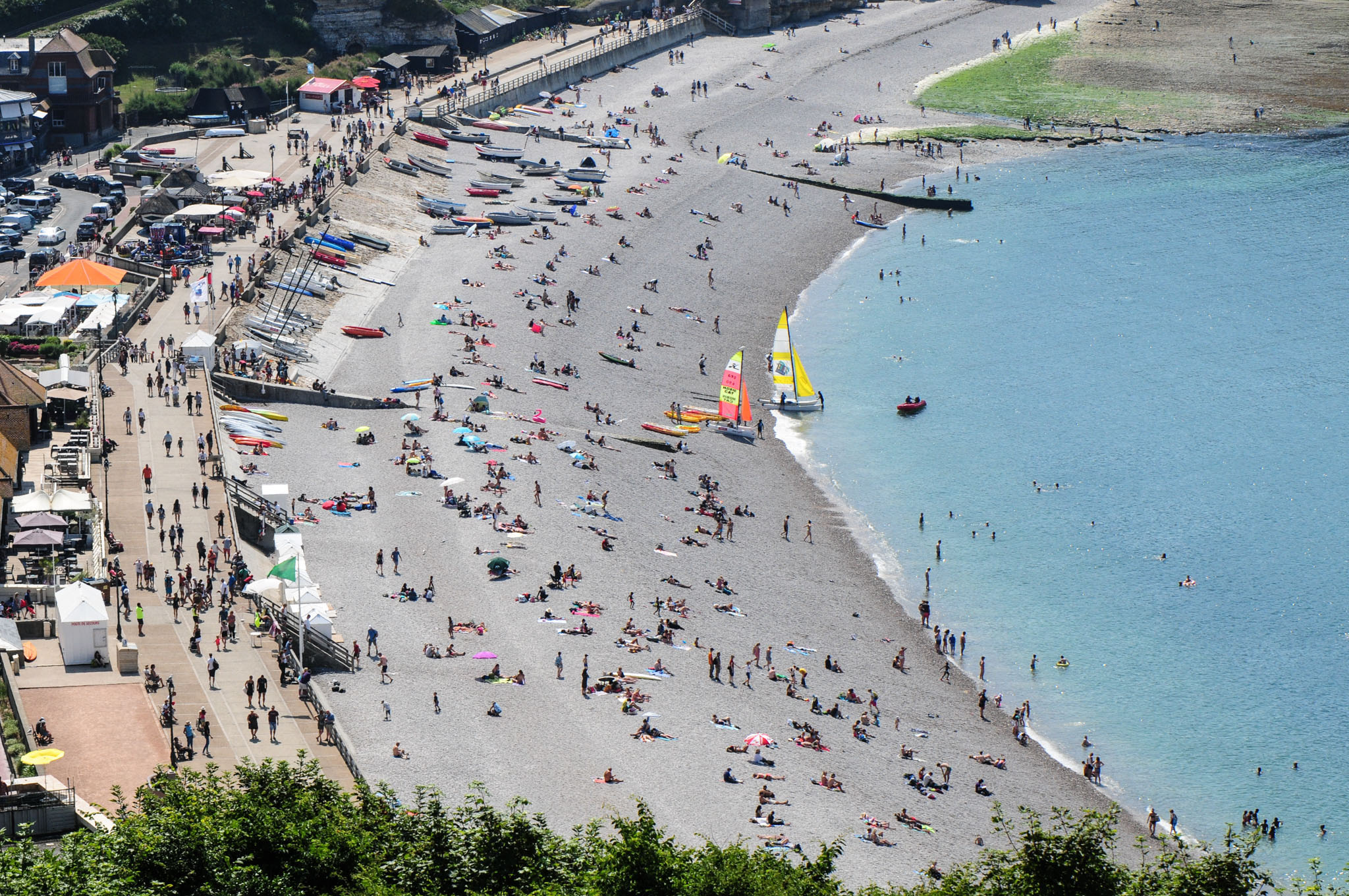 La plage de galets, large et vibrant sous l’assaut régulier des vagues, offre un premier regard sur les falaises. À chaque ressac, le bruit caractéristique des galets compose une musique singulière, signature sonore du littoral normand.