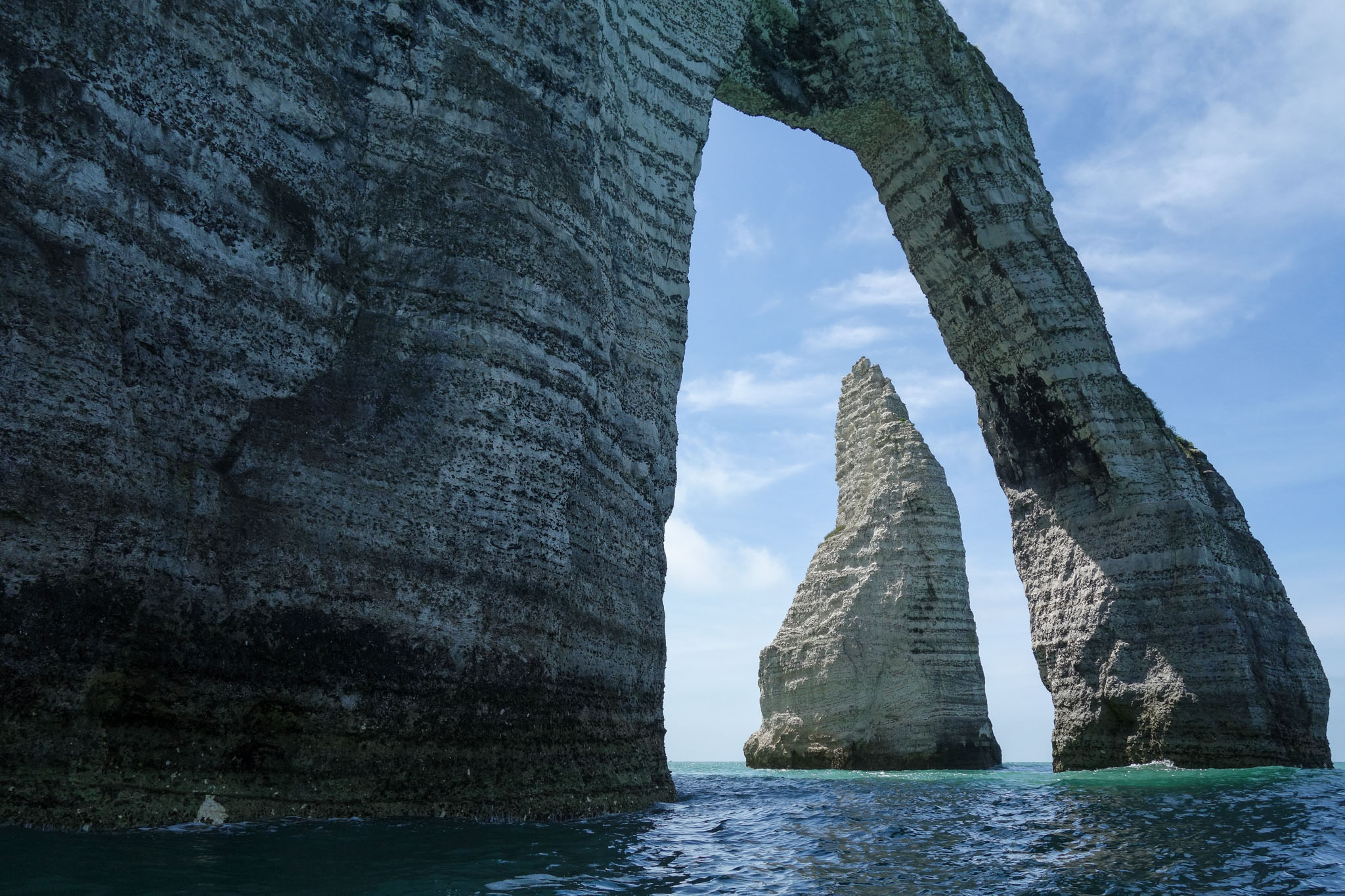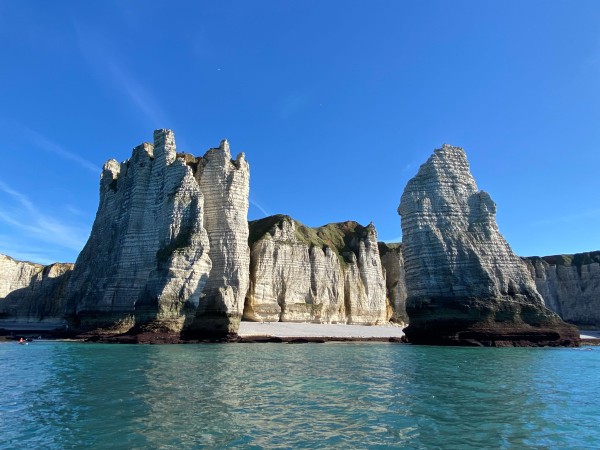 À l’ouest, la falaise d’Aval dévoile la célèbre Aiguille, un monolithe de 70 mètres qui se dresse dans la mer comme un totem naturel. Juste à côté, la Manneporte, immense arche sculptée par les siècles, ajoute une dimension mythologique au paysage. Selon la lumière du jour, les falaises passent du blanc éclatant au doré, puis au gris bleuté — un tableau en perpétuelle métamorphose.